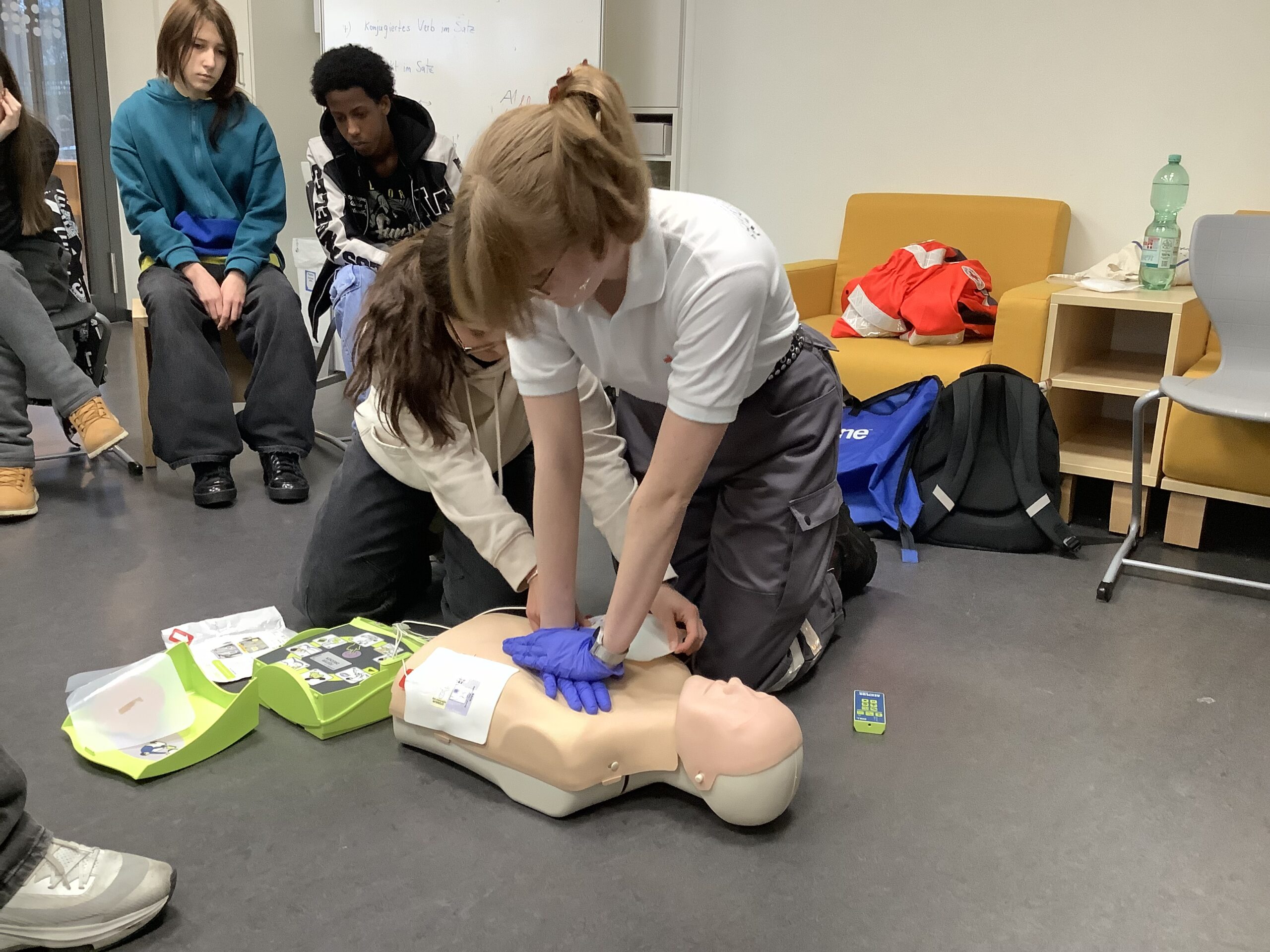 Kritisch prüft eine junge Frau in Uniform des Deutschen Roten Kreuzes Alinas Puls. Ist alles